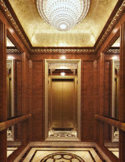 轿壁:木质饰面造型、玫瑰镜面不锈钢;